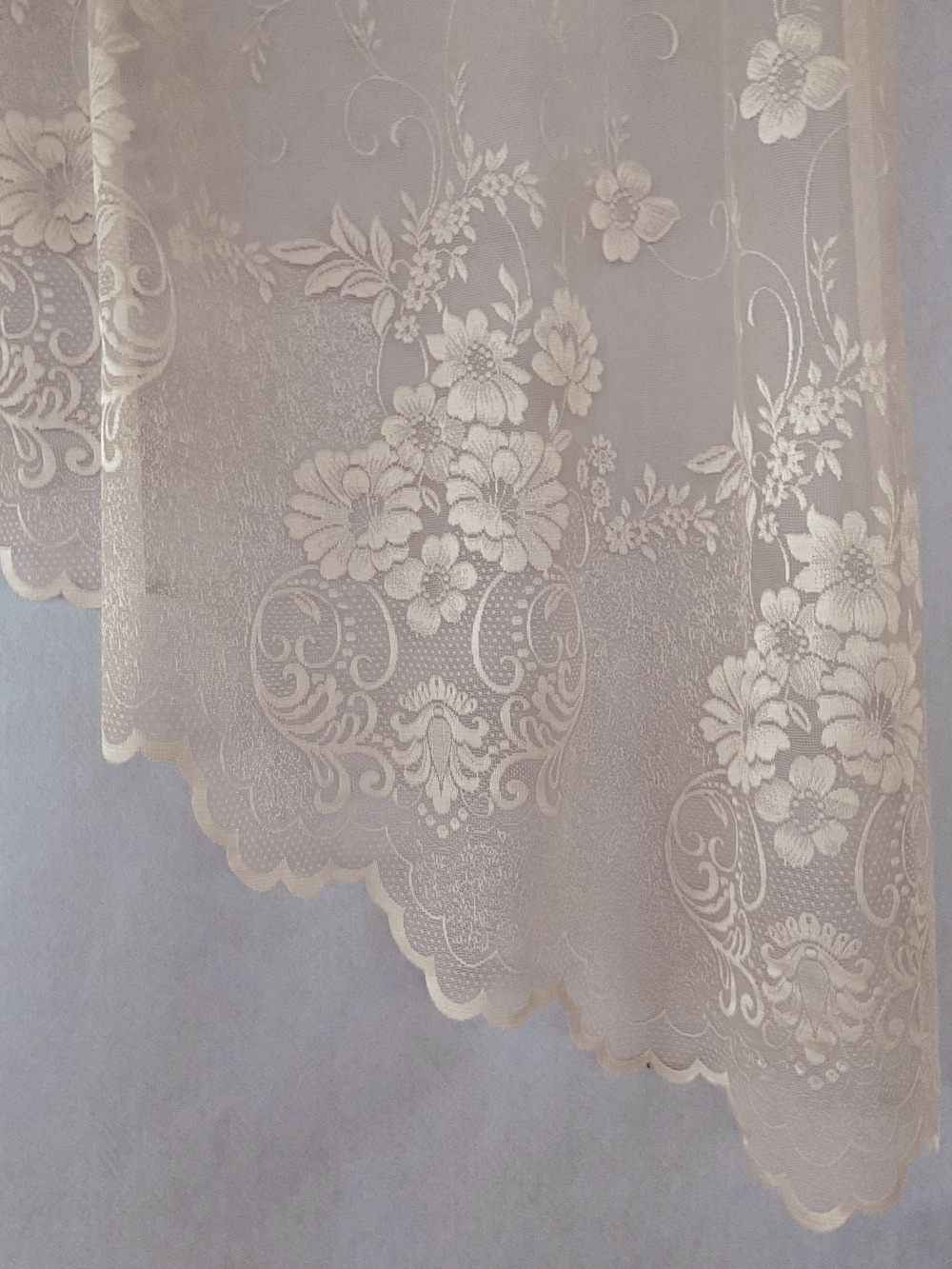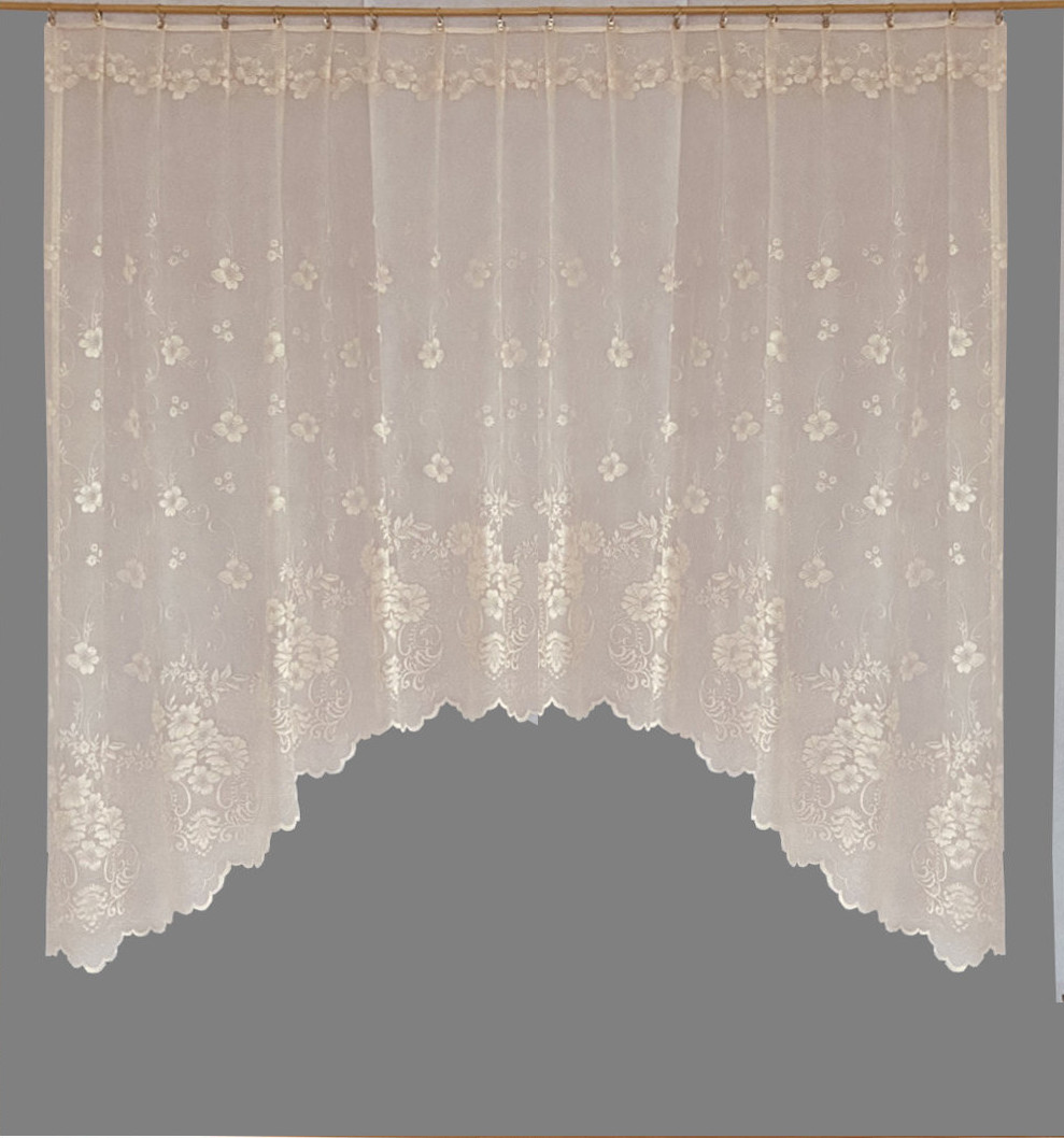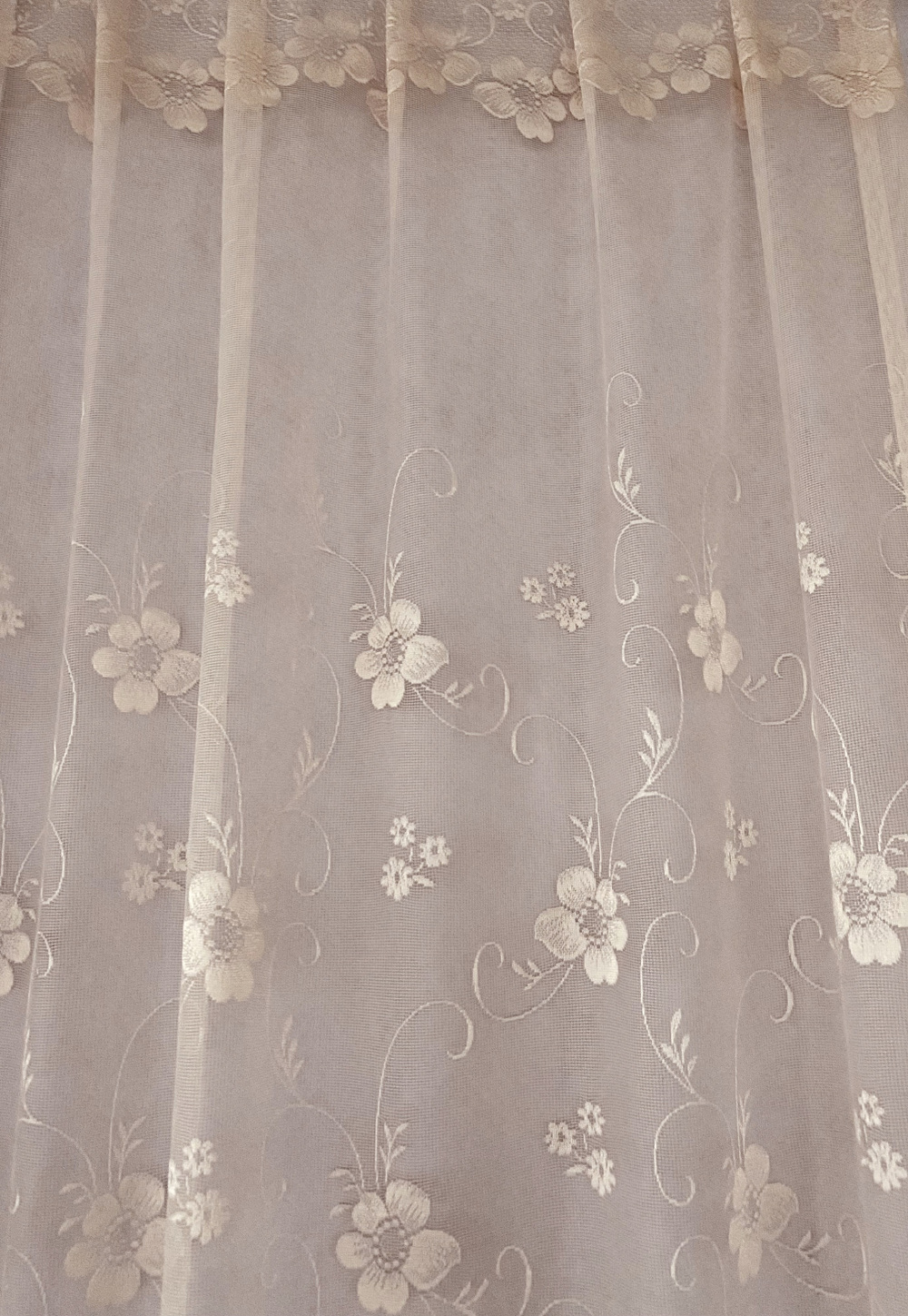 Hele õrnroosa  lillemustriline kaarega pitskardin, laineline alläär,