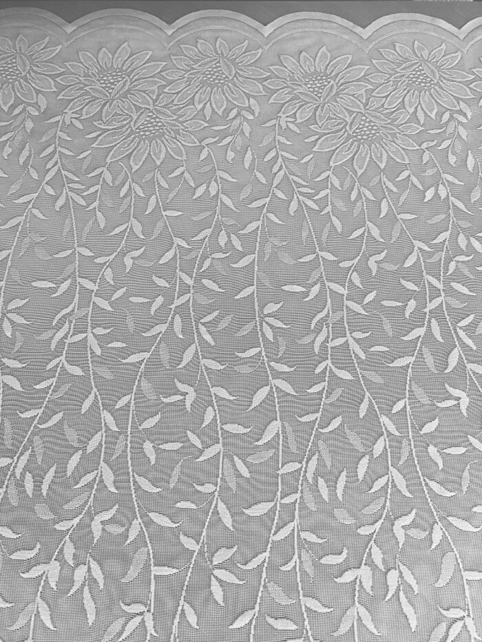 Valgust läbilaskev, nii ülevalt kui alt lillelise mustri portega, lainelise äärega pitskardina kangas. Kanga kõrgus on 205cm ja ülevalt tagasipööratuna saab kardina kõrgust muuta 165-205 cm.