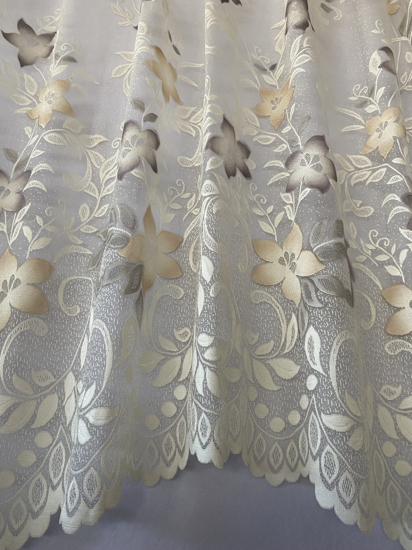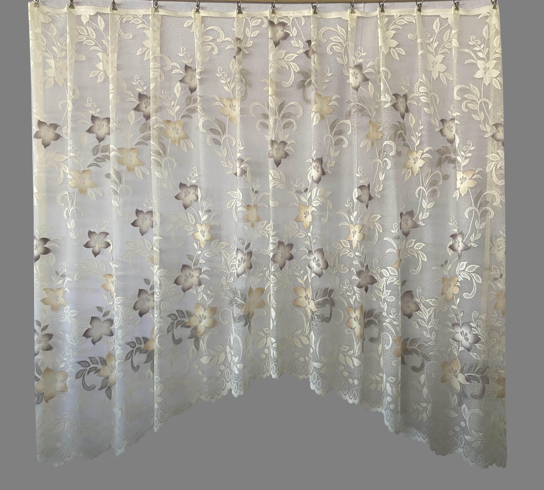 Kaarega pitskardin: natural valgel beezikad ja rohekad lilled, laineline alläär,