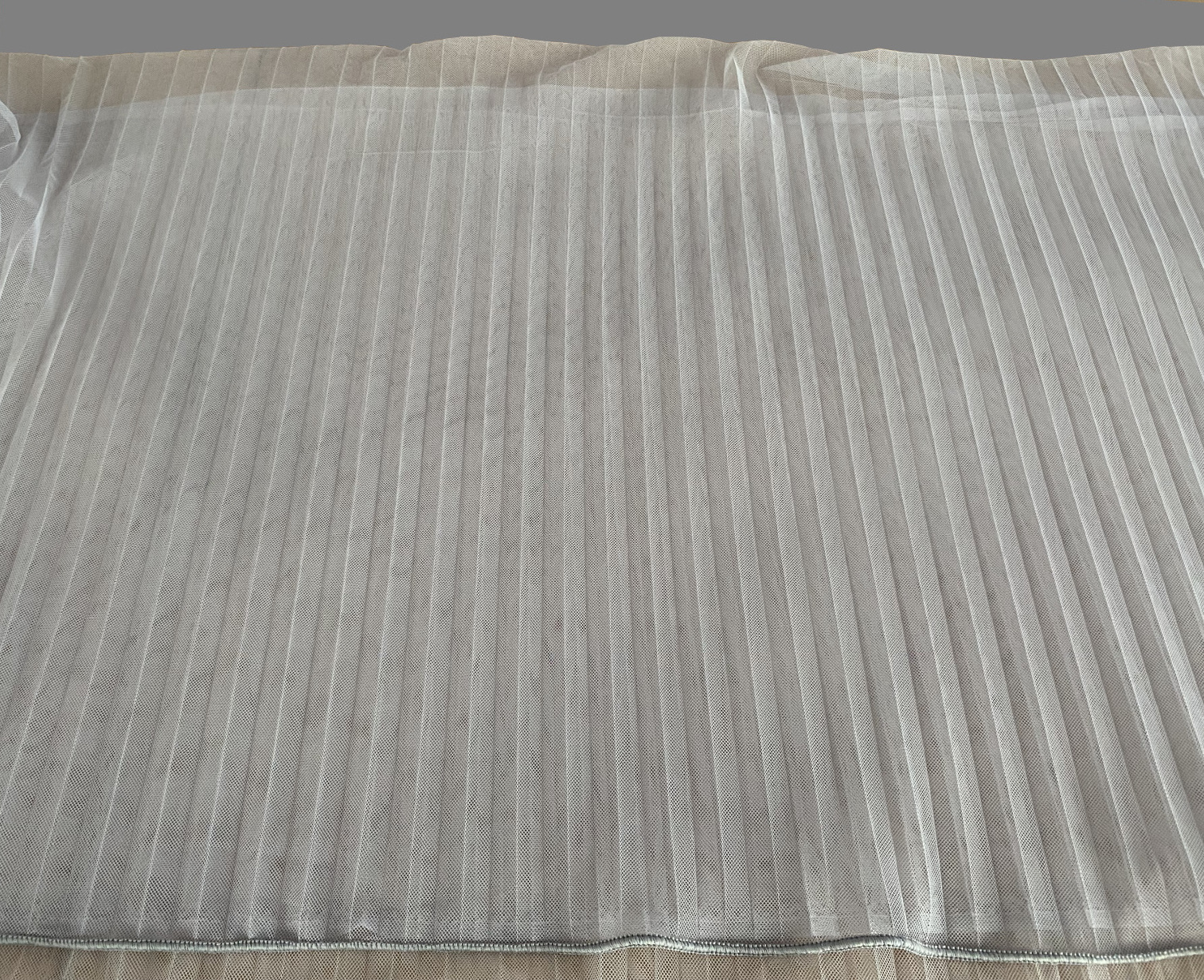 Plisseritud võrk-vuaalkangas. Läbipaistev, õhuke, võrgulise struktuuriga elegantne kardinakangas. Kanga allservas on raskuspael.