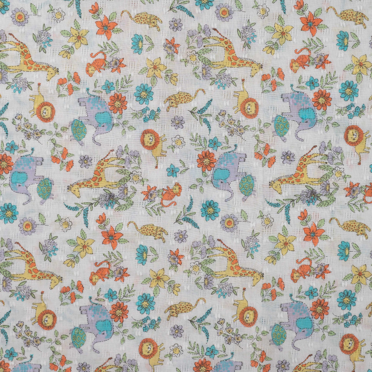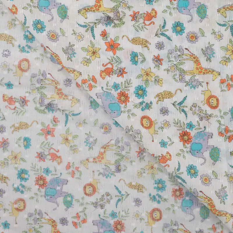See 100% puuvillane, pehme kangas on kaetud veidra kaelkirjakute, elevantide ja lilledega. Kerge ja õhulise tundega sobib see ideaalselt suvekleidiks või voodipesuks ning samuti pakub mitmekülgset valikut mitmesugusteks rakendusteks.