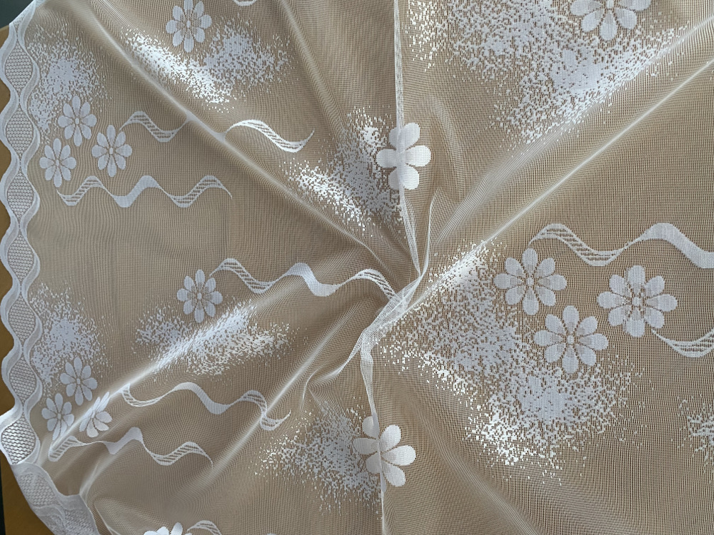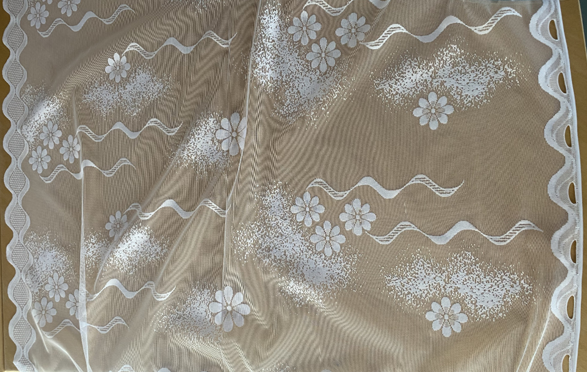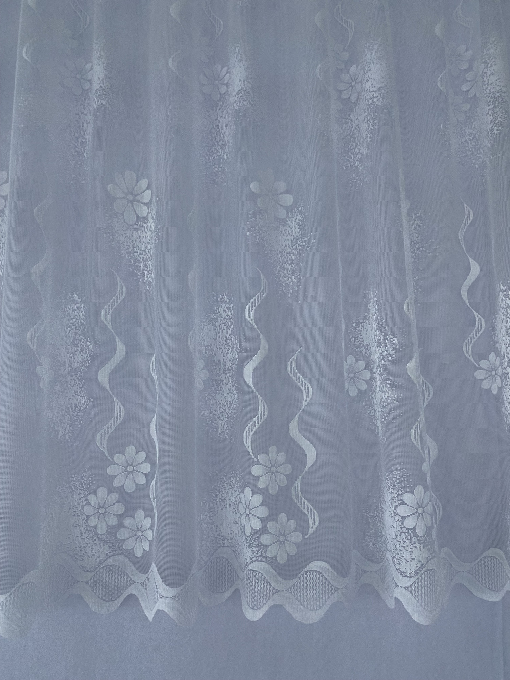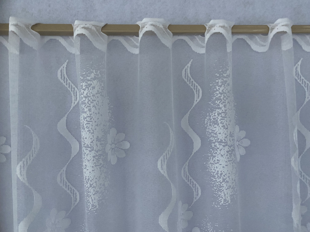 Valgust läbilaskev, valge, lillemuster, lainelise alläärega pitskardina kangas. Kuna kangal on juba üleval ääres augud siis sobib kardin kitsale kardinapuule või kardinasiinile.