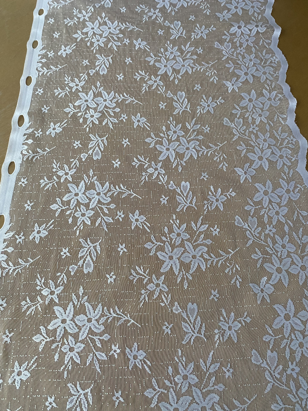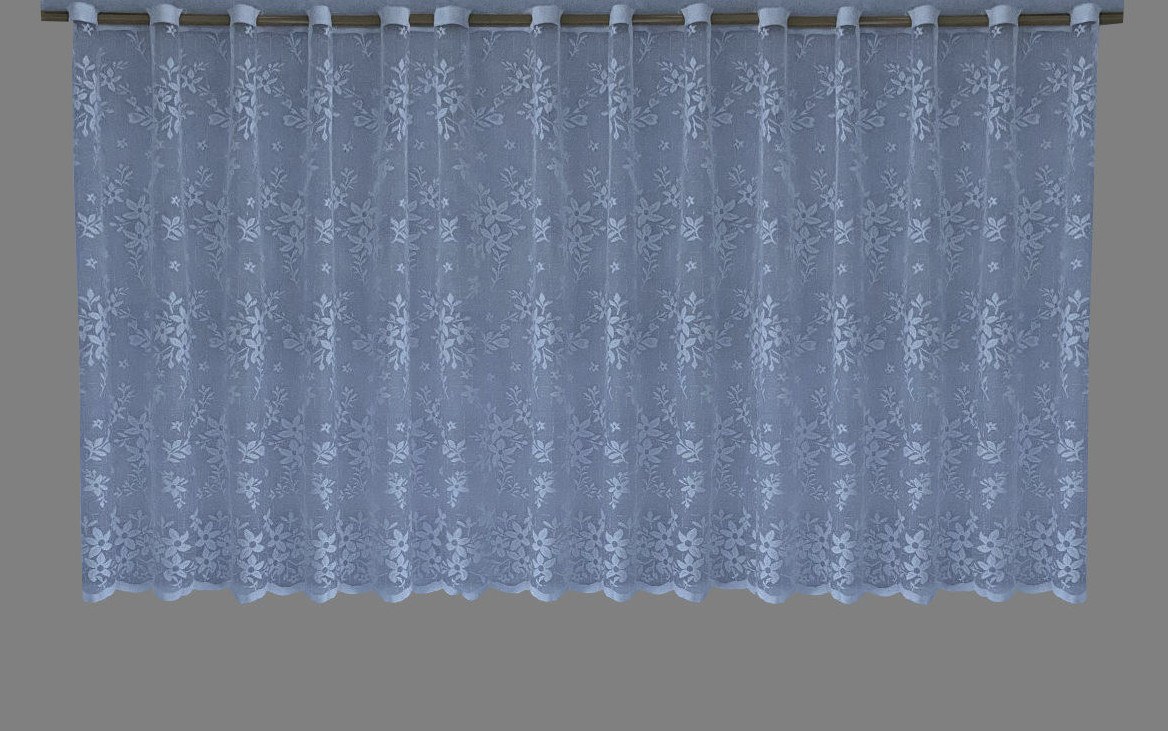 Valgust läbilaskev, valge, lillemuster, õrnalt sädelev lainelise alläärega pitskardina kangas. Kuna kangal on juba üleval ääres augud siis sobib kardin kitsale kardinapuule või kardinasiinile.