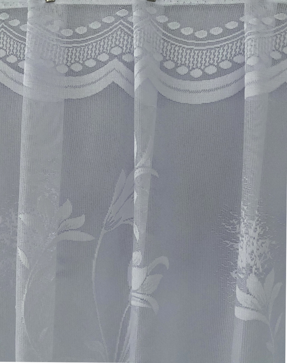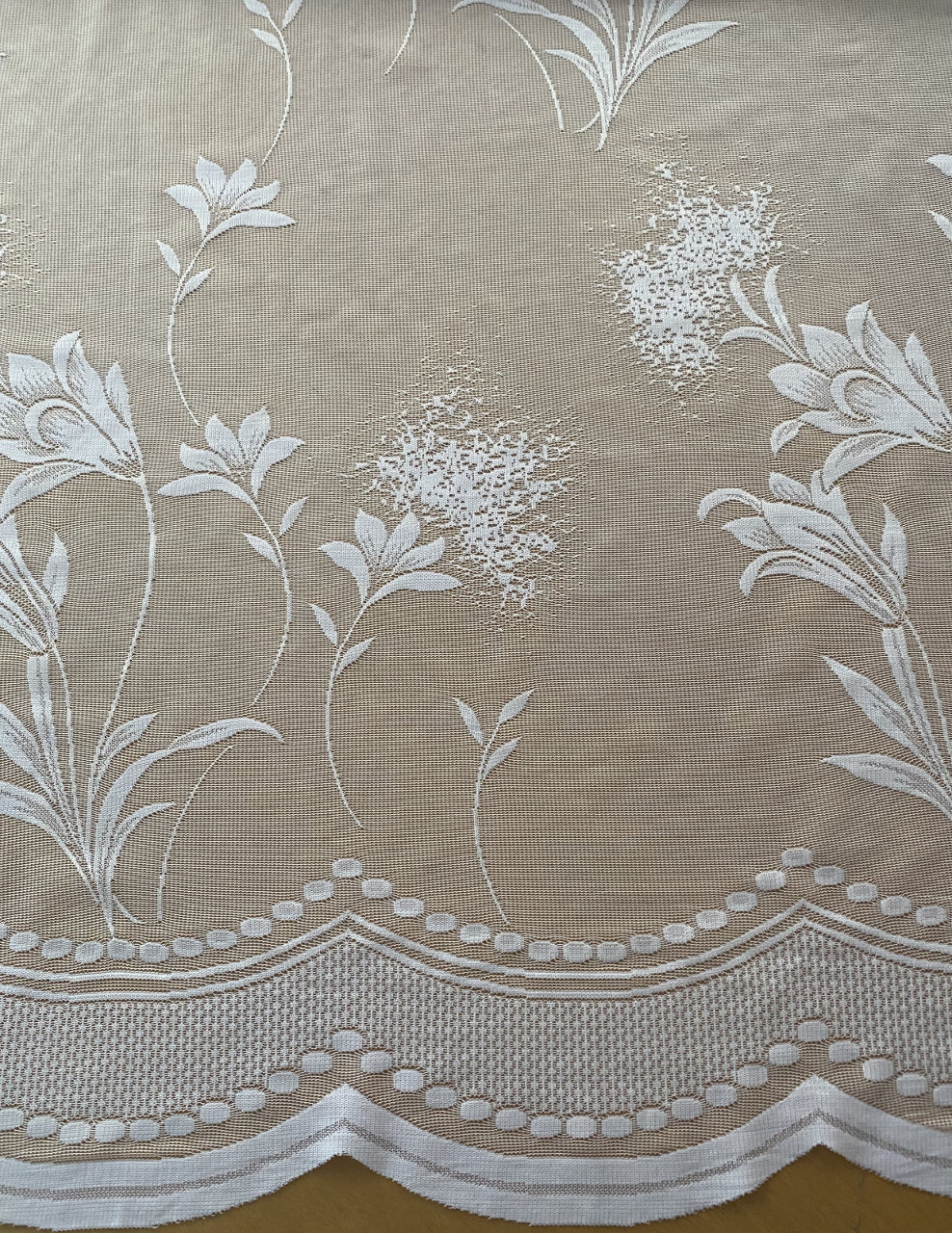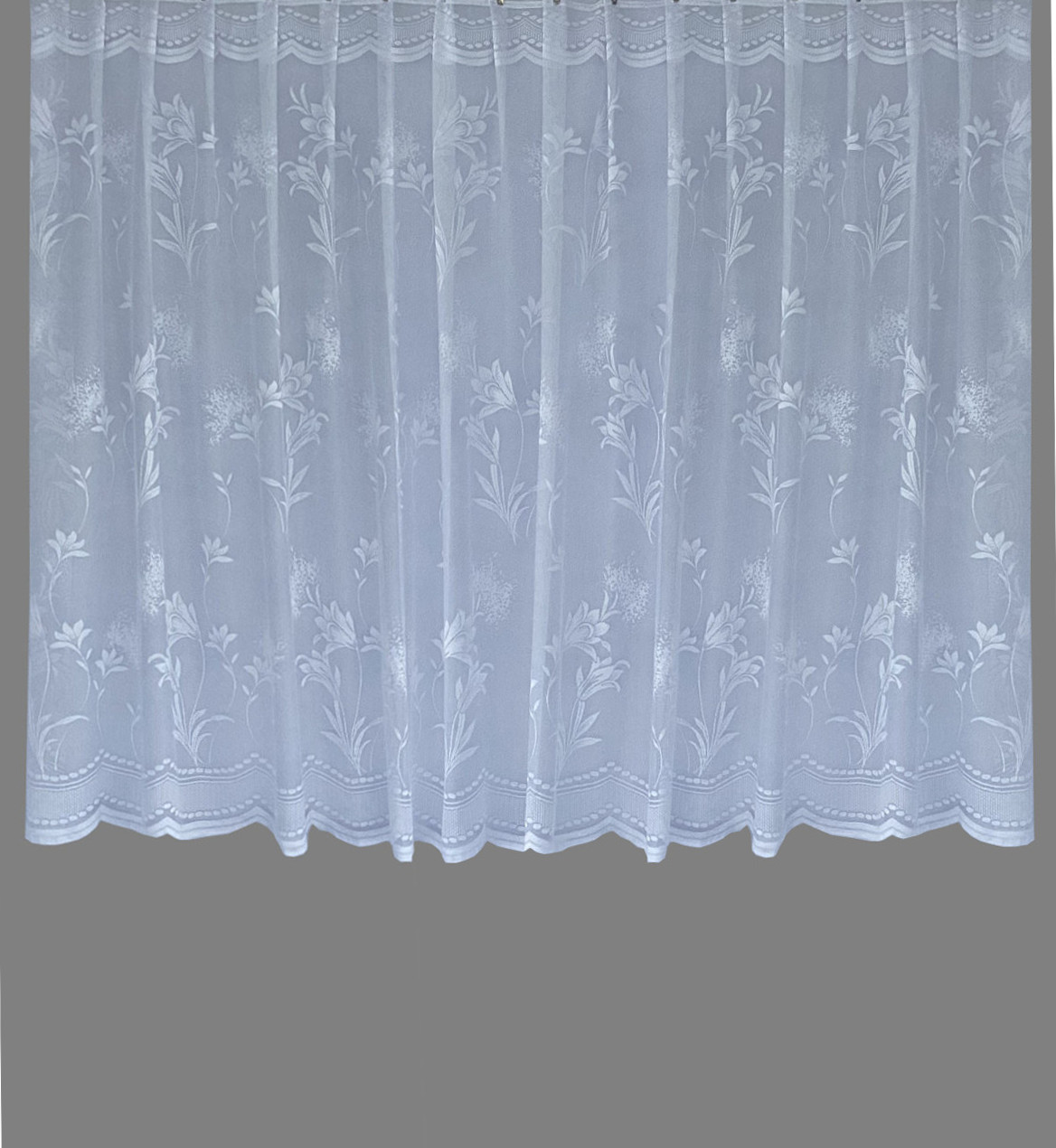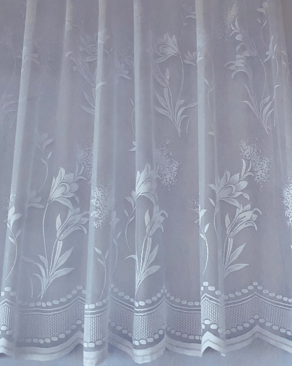Valgust läbilaskev, valge, lillmustriline, lainelise alläärega pitskardin, kõrgus-150cm. Hind on arvestatud kroogitava kardinapaelaga kardinale mis sobib konksudega kardinapuule ja kardinapuu siinile. Kui soovite torukanaliga kardinat, siis lisage see oma erisoovidesse.