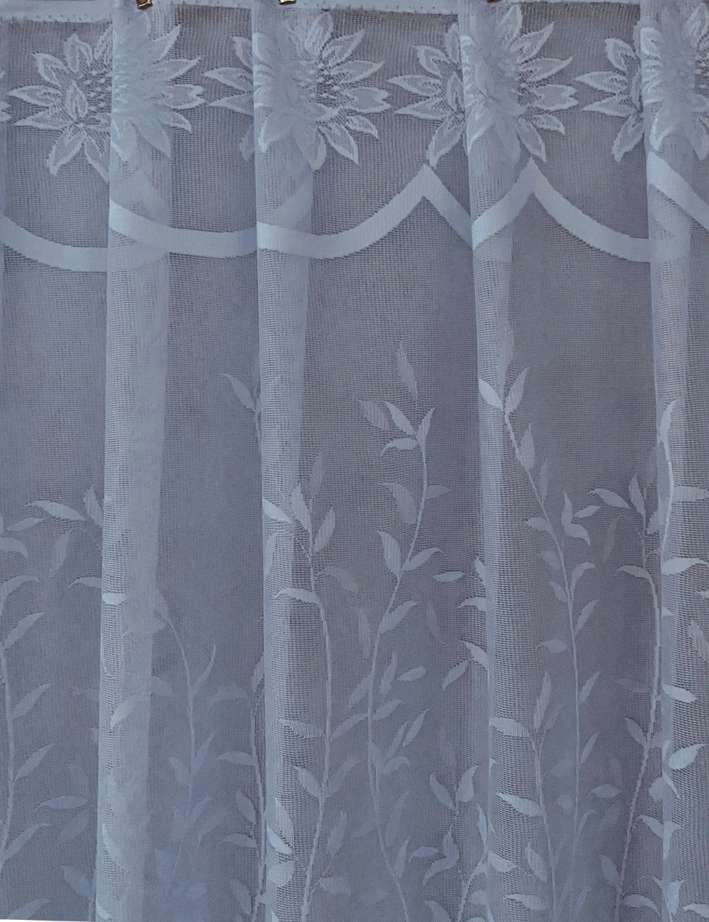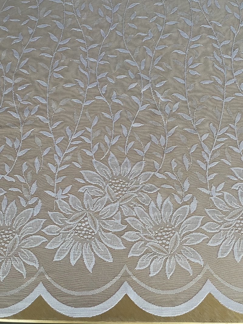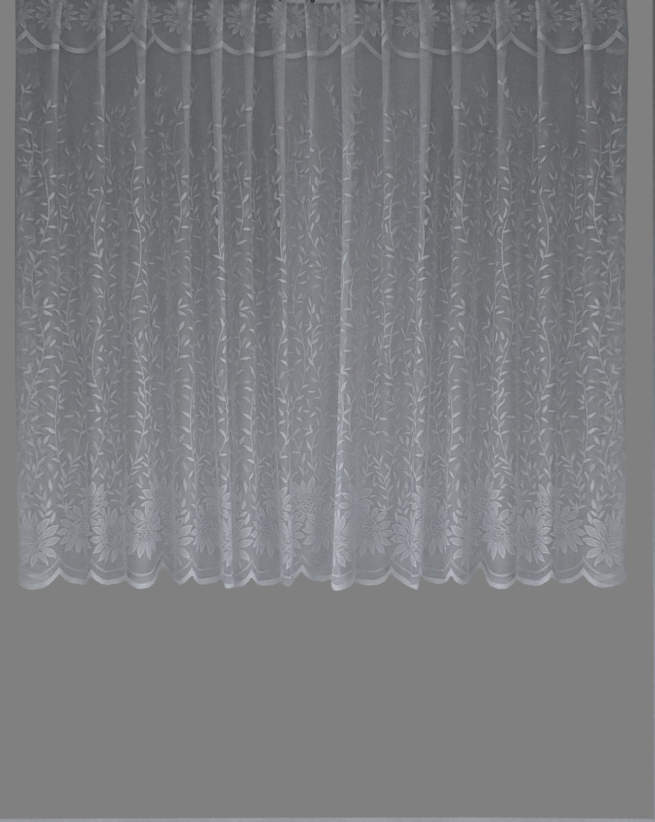 Valgust läbilaskev, valge, lillmustriline, lainelise alläärega pitskardin, kõrgus-150cm. Hind on arvestatud kroogitava kardinapaelaga kardinale mis sobib konksudega kardinapuule ja kardinapuu siinile. Kui soovite torukanaliga kardinat, siis lisage see oma erisoovidesse.