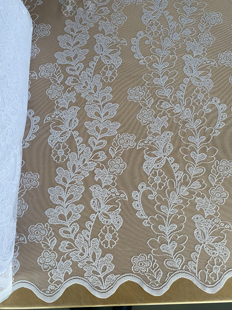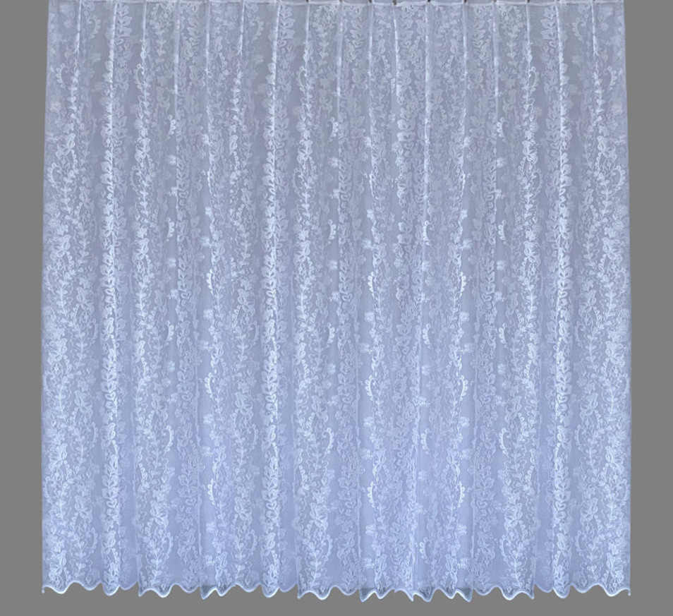 Valgust läbilaskev, valge, mustriline, lainelise alläärega pitskardin, kõrgus-250cm. Hind on arvestatud kroogitava kardinapaelaga kardinale mis sobib konksudega kardinapuule ja kardinapuu siinile. Kui soovite torukanaliga kardinat, siis lisage see oma erisoovidesse.