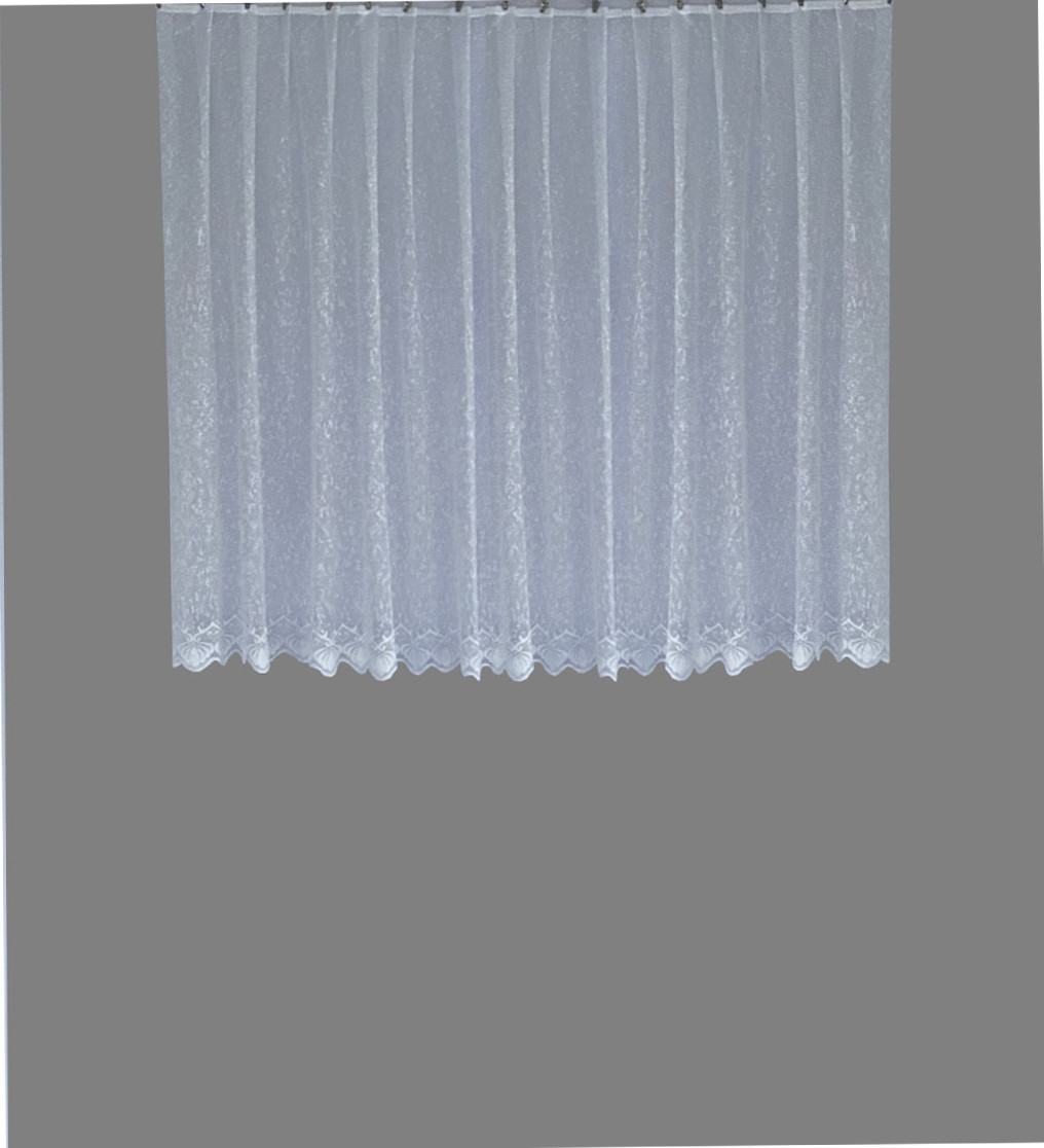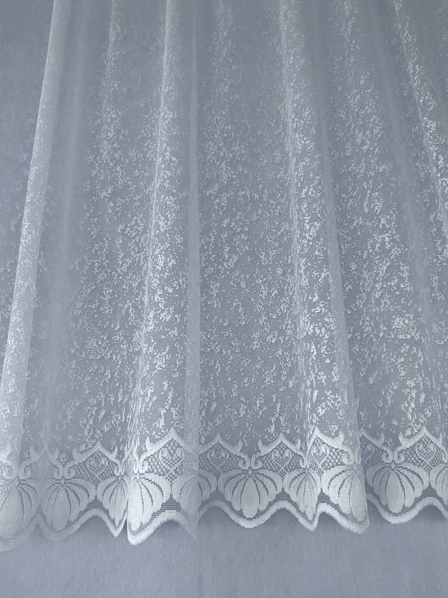Valged, valgust läbilaskvad, väikse mustriga, lainelise alläärega pitskardinad, kõrgus: 140cm.