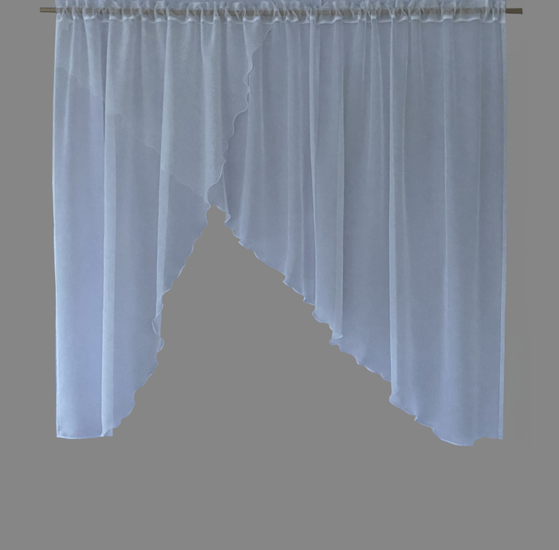 valge vuaalkangas, venitatud servadega, valgust läbilaskev kerge kangas, 100% polüester, 30° õrnpesu.