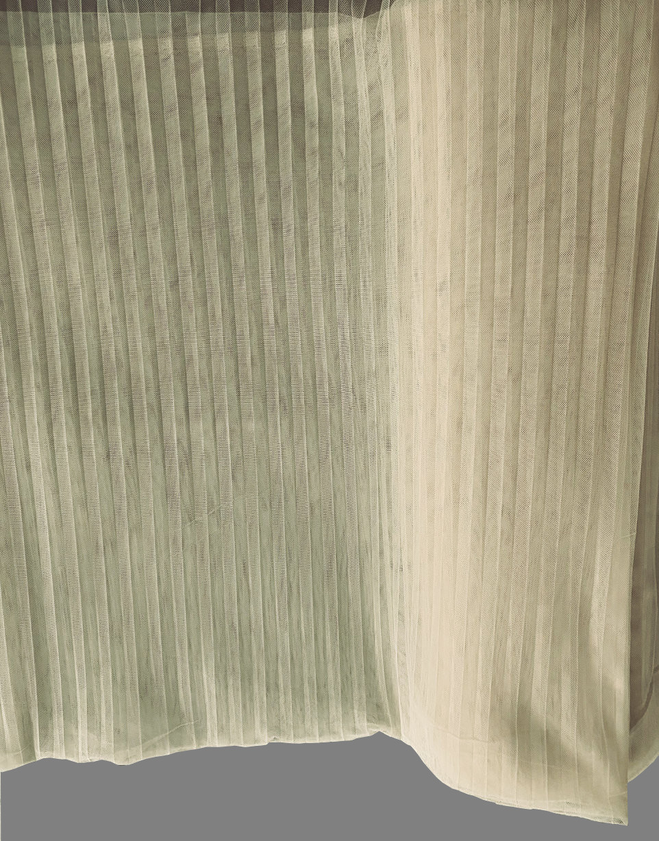 Plisseritud võrk-vuaalkangas. Läbipaistev, õhuke, võrgulise struktuuriga elegantne kardinakangas. Kanga allservas on raskuspael.
