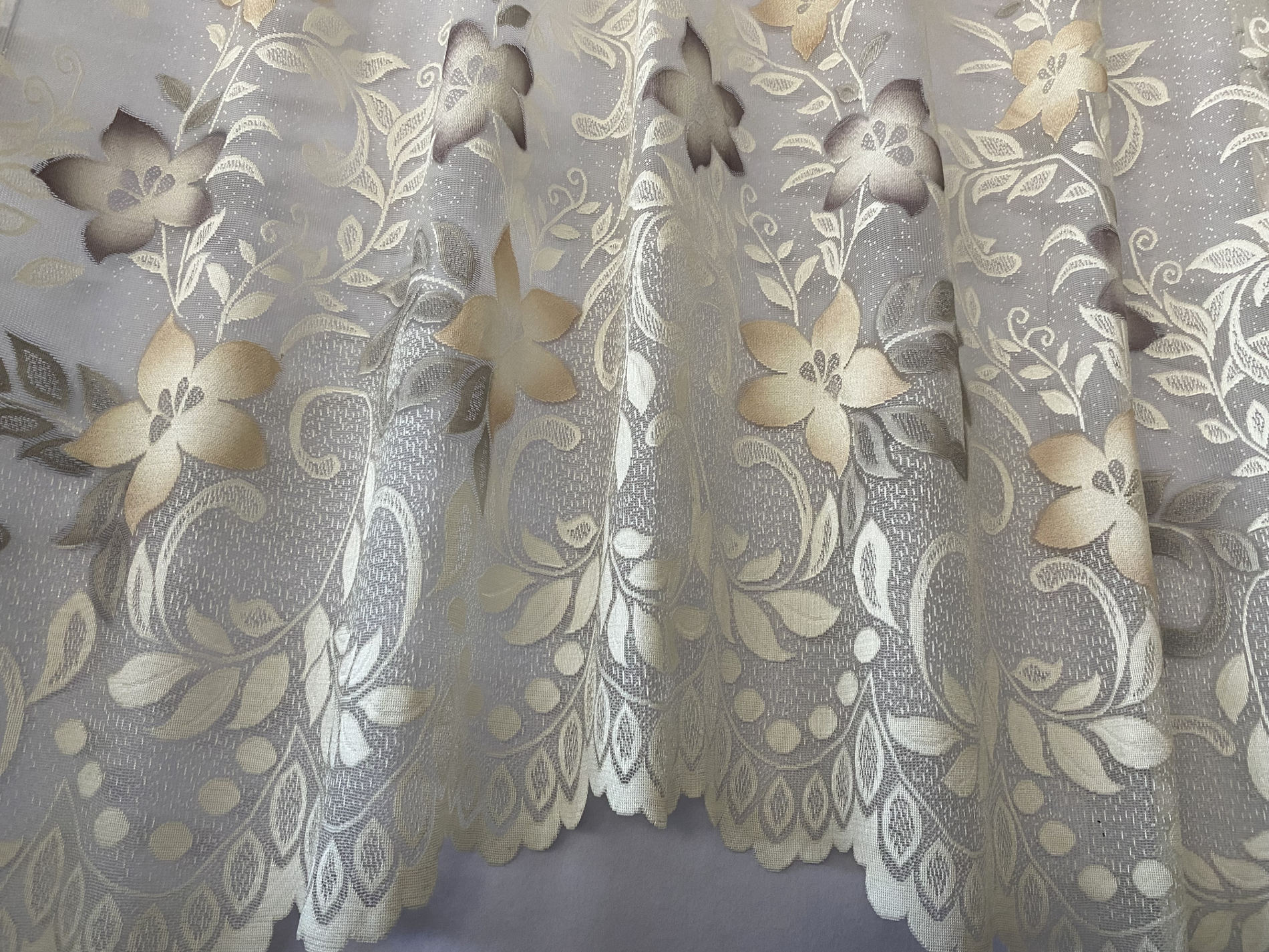 Kaarega pitskardin: natural valgel beezikad ja rohekad lilled, laineline alläär,