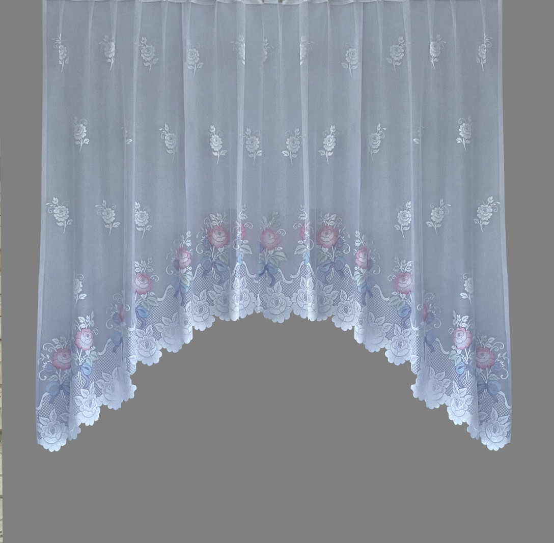 Kaarega pitskardin: Valgel põhjal värvilised roosid.