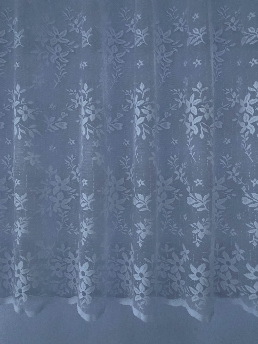 Valgust läbilaskev, valge, lillemuster, õrnalt sädelev lainelise alläärega pitskardina kangas. Kuna kangal on juba üleval ääres augud siis sobib kardin kitsale kardinapuule või kardinasiinile.