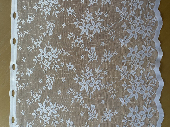 Valgust läbilaskev, valge, lillemuster, õrnalt sädelev lainelise alläärega pitskardina kangas. Kuna kangal on juba üleval ääres augud siis sobib kardin kitsale kardinapuule või kardinasiinile.