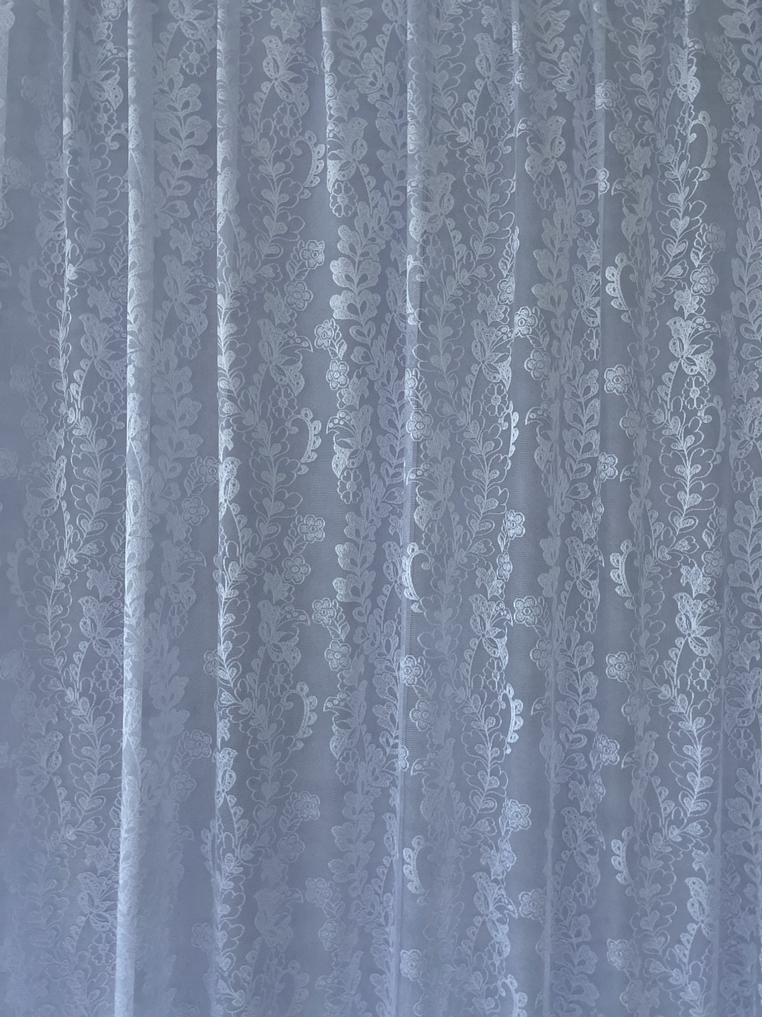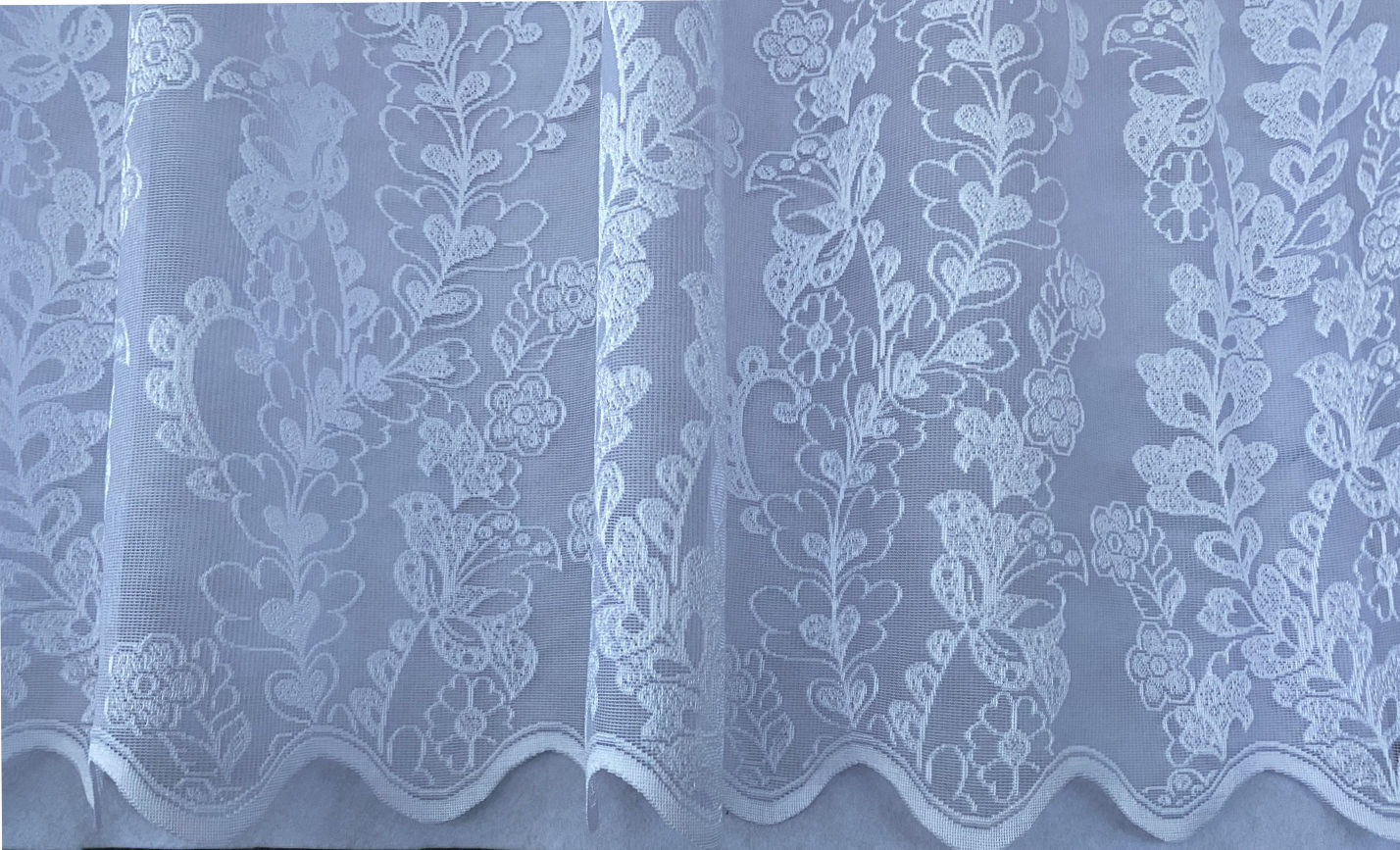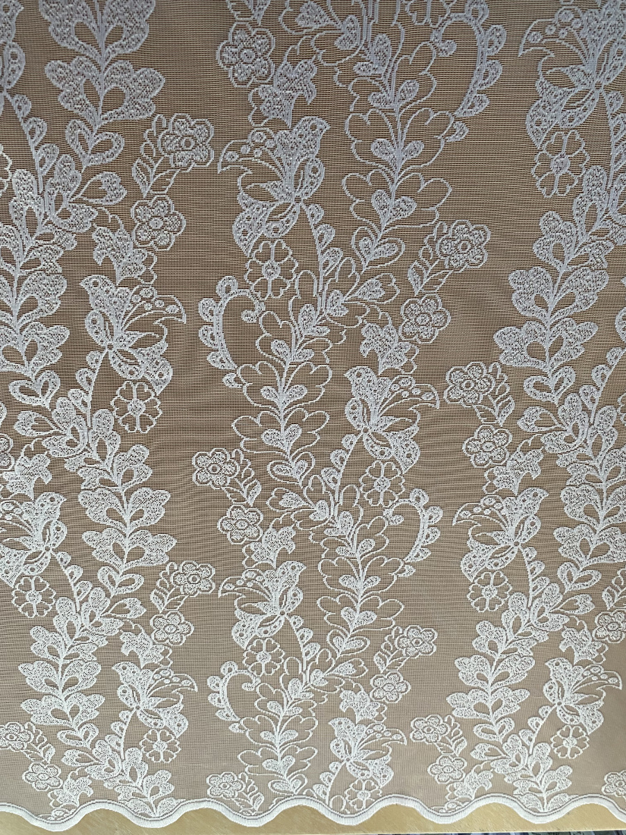Valgust läbilaskev, valge, mustriline, lainelise alläärega pitskardina kangas, kõrgus-250cm.
