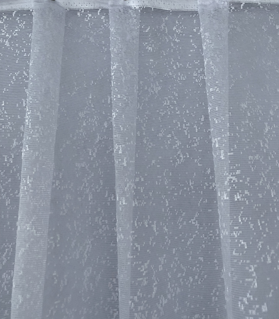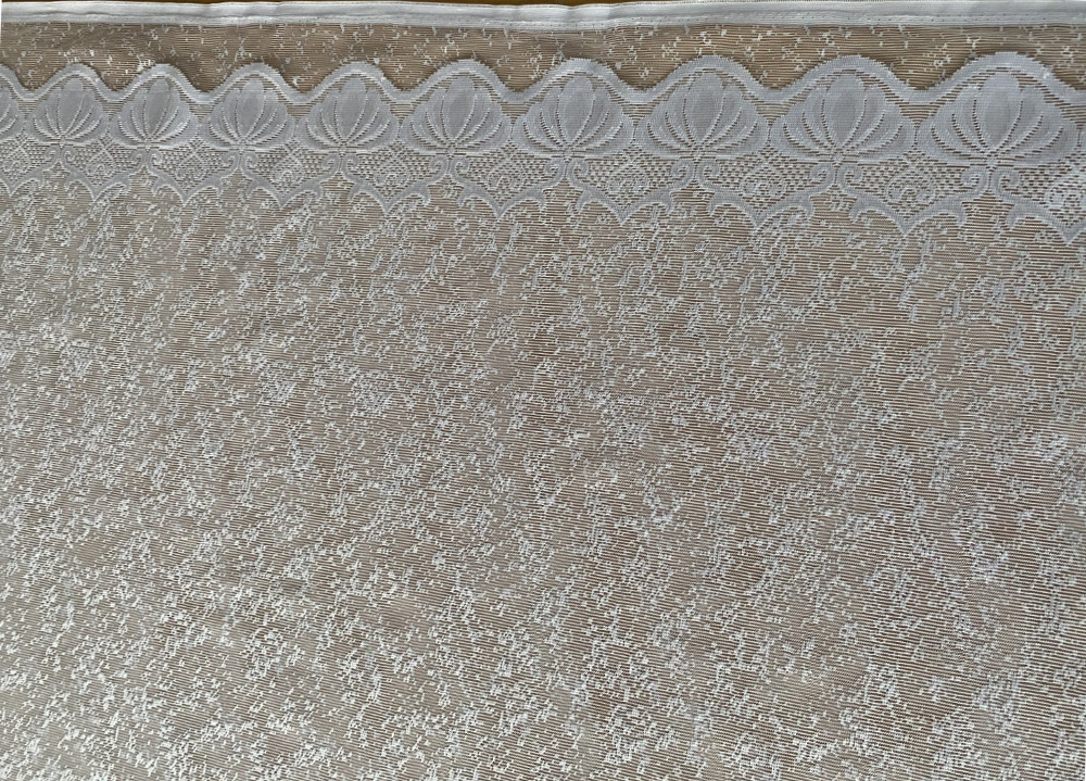 Valged, valgust läbilaskvad, väikse mustriga, lainelise alläärega pitskardinad, kõrgus: 140cm.
