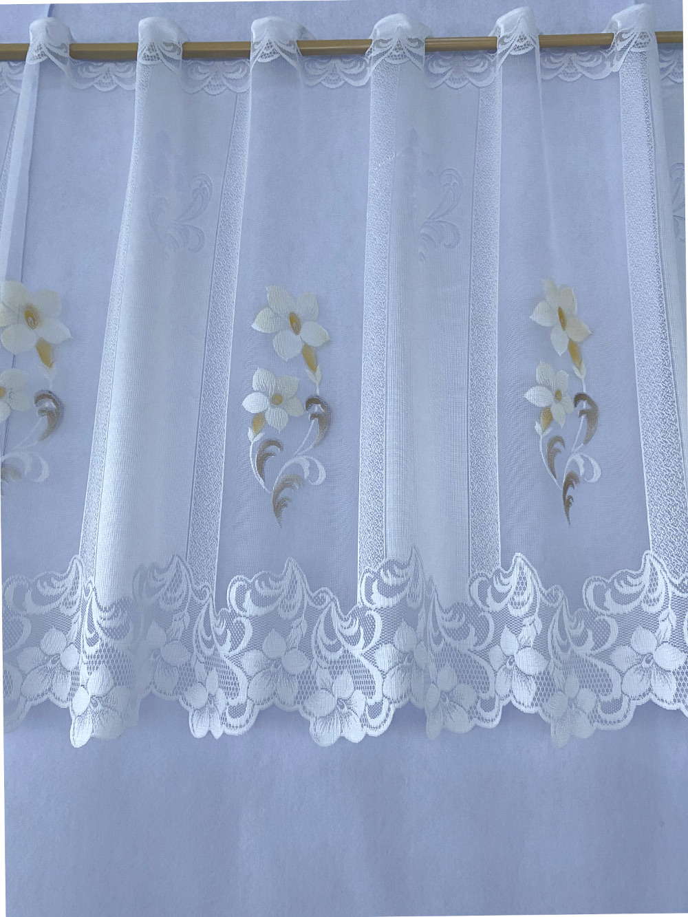 Valgust läbilaskev, valgel põhjal kollase-beezikirju lillemusteriga, lainelise alläärega pitskardinad.
