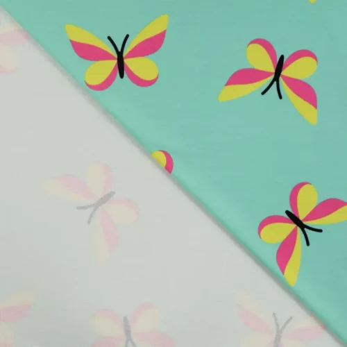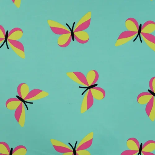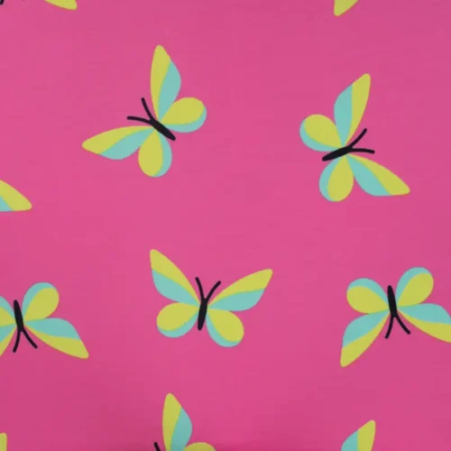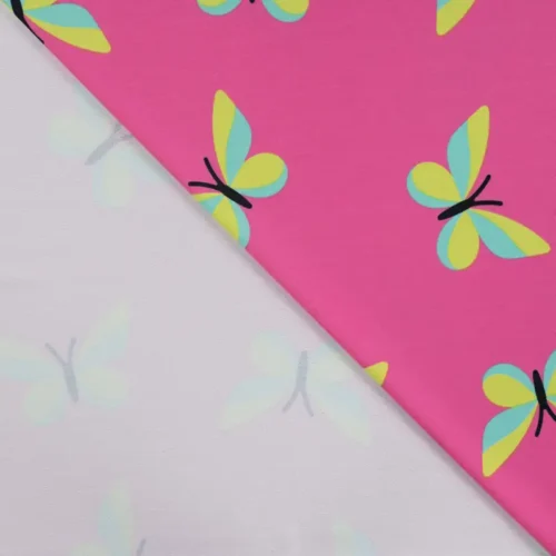 Puuvillane popliin: peen ruudumuster ja värvilised liblikamotiivid.
